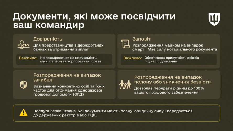У Міністерстві оборони України пояснюють: деякі документи можна оформити безпосередньо у військовій частині. Командири мають повноваження посвідчувати їх, і вони мають таку ж юридичну силу, як і нотаріально засвідчені.